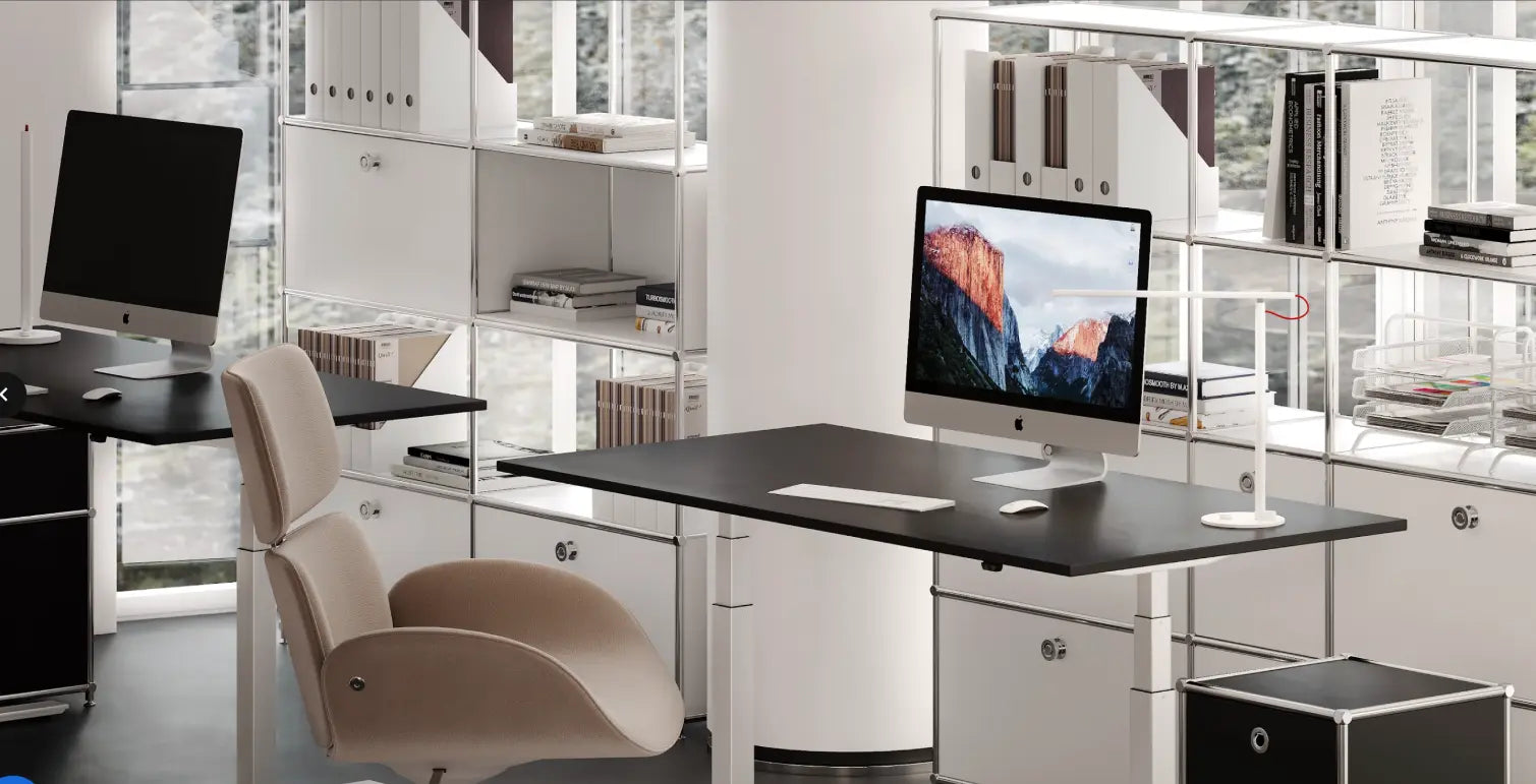 In an ergonomic workplace, all office furniture and equipment are ideally coordinated with each other and with the user. The desk and office chair are designed according to anatomical principles. Prolonged sitting puts strain on the back, shoulders, and neck. Prolonged standing strains the legs and venous system. Ideally, you should alternate regularly between sitting and standing, preferably every two hours.